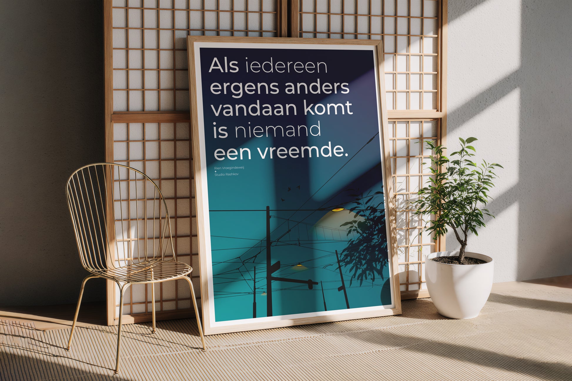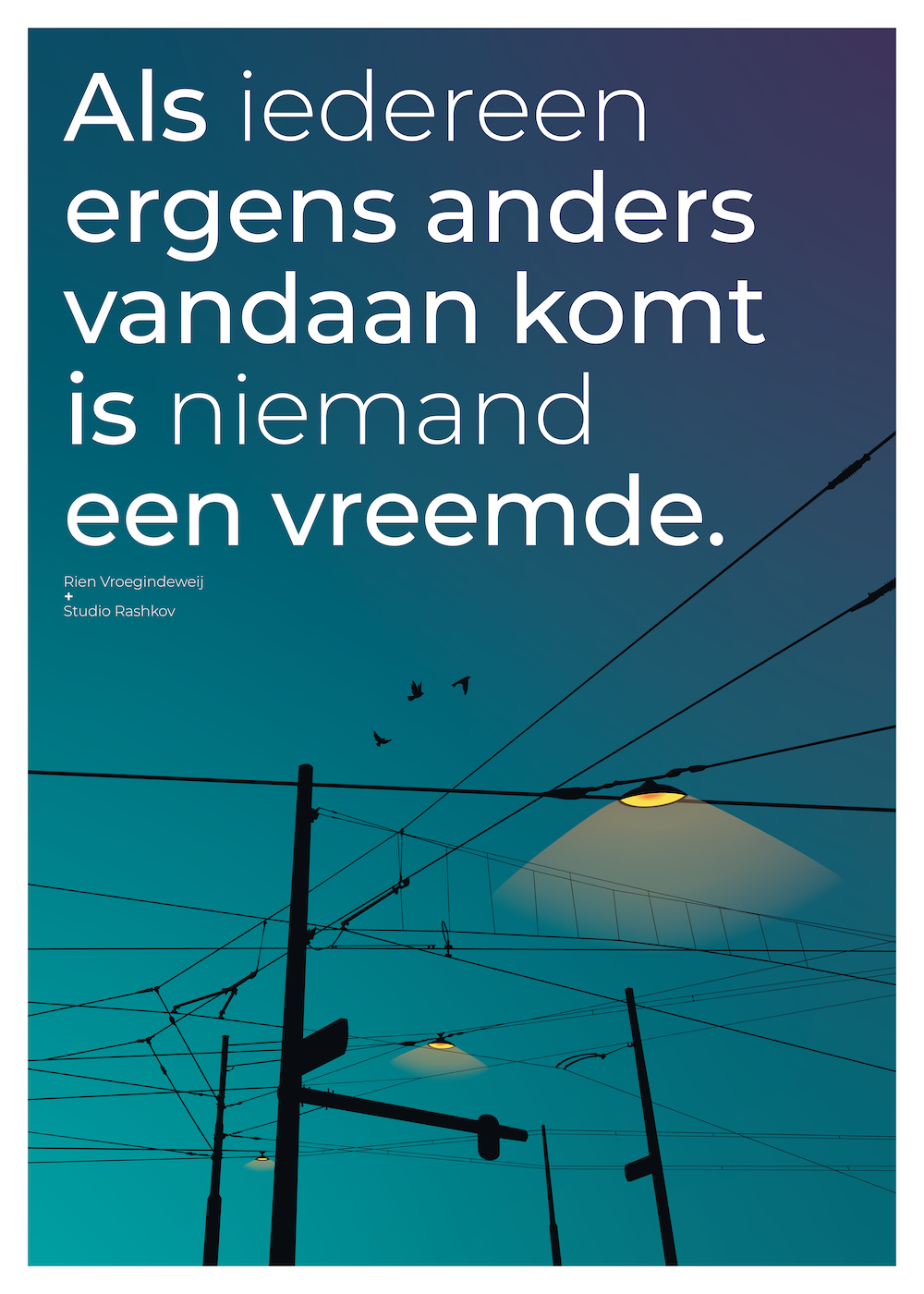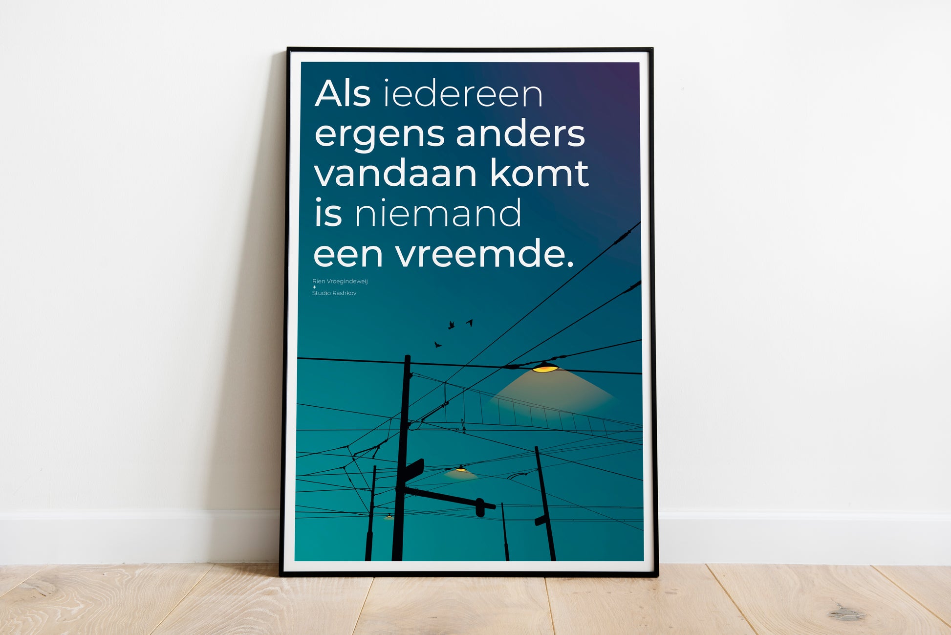 Unieke artprint van Studio Rashkov en de Rotterdamse dichter Rien Vroegindeweij. Zijn dichtregel, die als wandtekst een gevel in Rotterdam-West siert, is door studio Rashkov verbeeld in een krachtige illustratie – een bijzonder gesamtkunstwerk.
